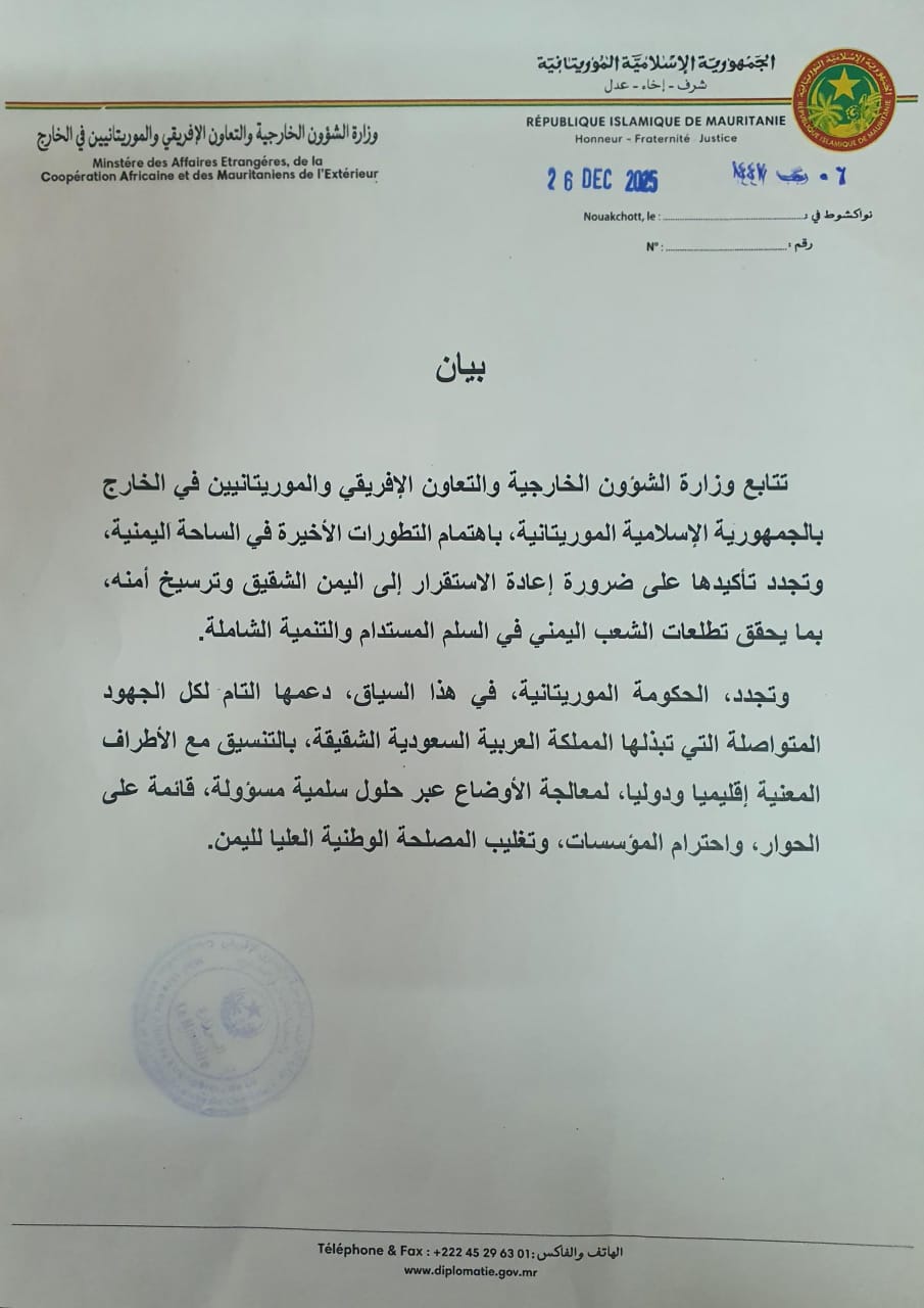 الخارجية الموريتانية تدعم جهود ترسيخ الإستقرار والأمن في اليمن