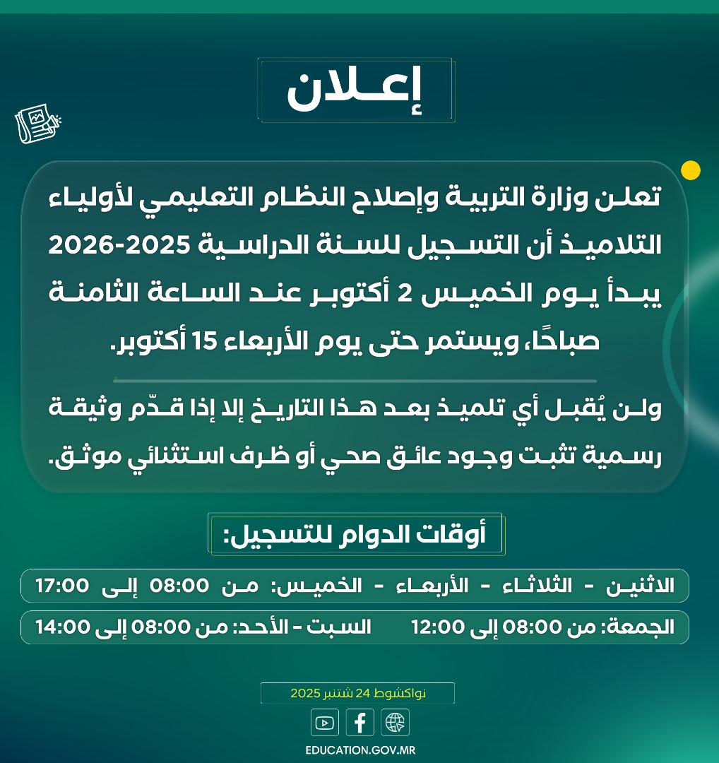 وزارة التربية: لن يقبل تسجيل أي تلميذ بعد 15 أكتوبر