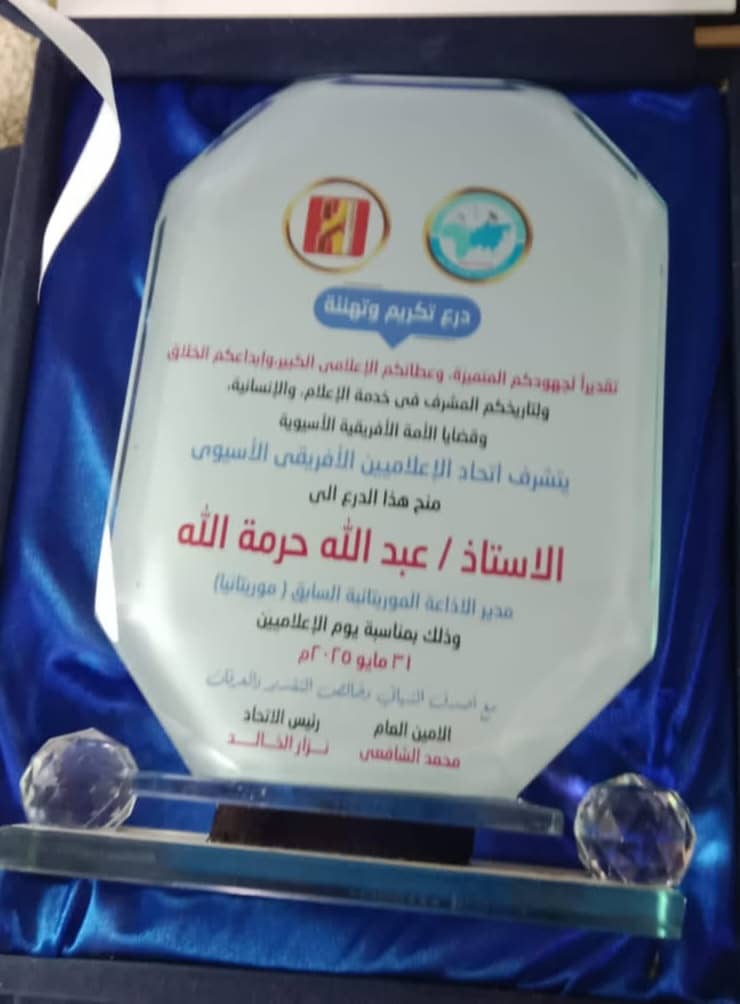 أعلن اتحاد الإعلاميين الإفريقي الآسيوي، زوال السبت في القاهرة عن تكريم الإعلامي والمدير السابق لإذاعة موريتانيا عبدالله حرمة الله بمناسبة يوم الإعلاميين، رفقة كوكبة من الاعلاميين والكتاب الافارقة، خلال حفل رفيع المستوى، ترأسه وزير الخارجية المصري السابق محمد العرابي، وحضرته الدبلوماسية الموريتانية حياتي ماموني، التي تسلمت درع التكريم وتلقت تهانئ المشاركين الذي اعتبرته لفتة ثمينة اتجاه النخب الموريتانية.
