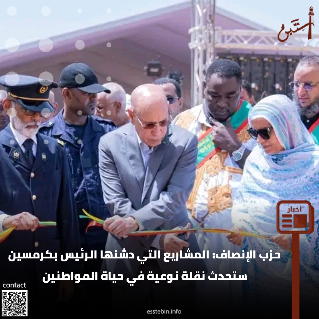 عبر حزب الإنصاف الحاكم، عن شكره لساكنة ولاية الترارزة عامة، وساكنة مقاطعة كرمسين خاصة، على ما قال إنهم أبدوه من حفاوة الاستقبال وصدق الانتماء وكرم الضيافة خلال زيارة رئيس الحزب، الوزير سيد أحمد ولد محمد، وذلك في إطار التحضيرات لزيارة العمل التي قام بها رئيس الجمهورية، محمد ولد الشيخ الغزواني، للمقاطعة.