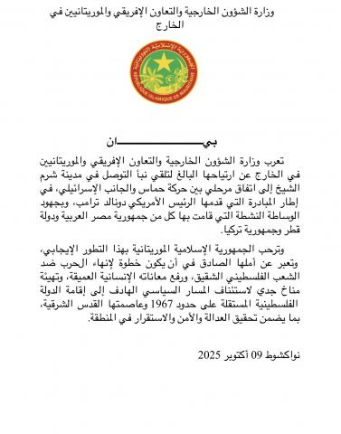 تعرب وزارة الشؤون الخارجية والتعاون الإفريقي والموريتانيين في الخارج عن ارتياحها البالغ لتلقي نبأ التوصل في مدينة شرم الشيخ إلى اتفاق مرحلي بين حركة حماس والجانب الإسرائيلي، في إطار المبادرة التي قدمها الرئيس الأمريكي دونالد ترامب، وبجهود الوساطة النشطة التي قامت بها كل من جمهورية مصر العربية ودولة قطر وجمهورية تركيا.
