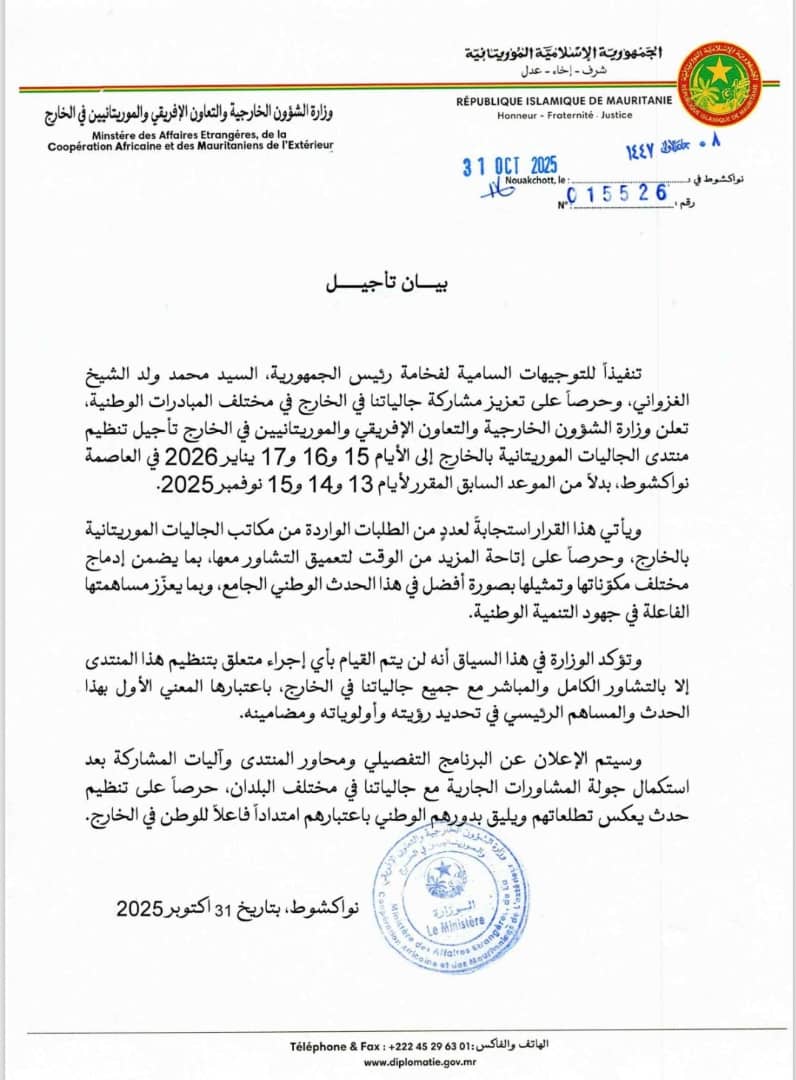 أعلنت وزارة الشؤون الخارجية والتعاون الإفريقي والموريتانيين في الخارج أنه؛ تنفيذا لتوجيهات رئيس الجمهورية، محمد ولد الشيخ الغزواني، وحرصا على تعزيز مشاركة جالياتنا في الخارج في مختلف المبادرات الوطنية، تقرر تأجيل تنظيم منتدى الجاليات الموريتانية في الخارج إلى أيام 15 و16 و17 يناير 2026 في العاصمة نواكشوط، بدلا من الموعد السابق (13 و14 و15 نوفمبر 2025).