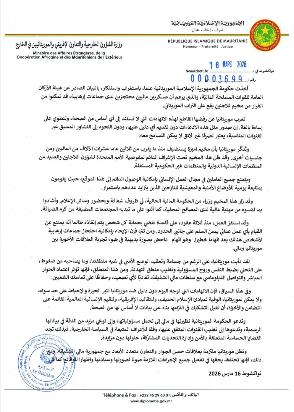 وأكدت موريتانيا، في بيان صادر الاثنين عن وزارة الشؤون الخارجية والتعاون الإفريقي والموريتانيين في الخارج، رفضها القاطع لهذه الادعاءات، ووصفتها بأنها اتهامات باطلة لا تستند إلى أي دليل وتنطوي على إساءة بالغة.
