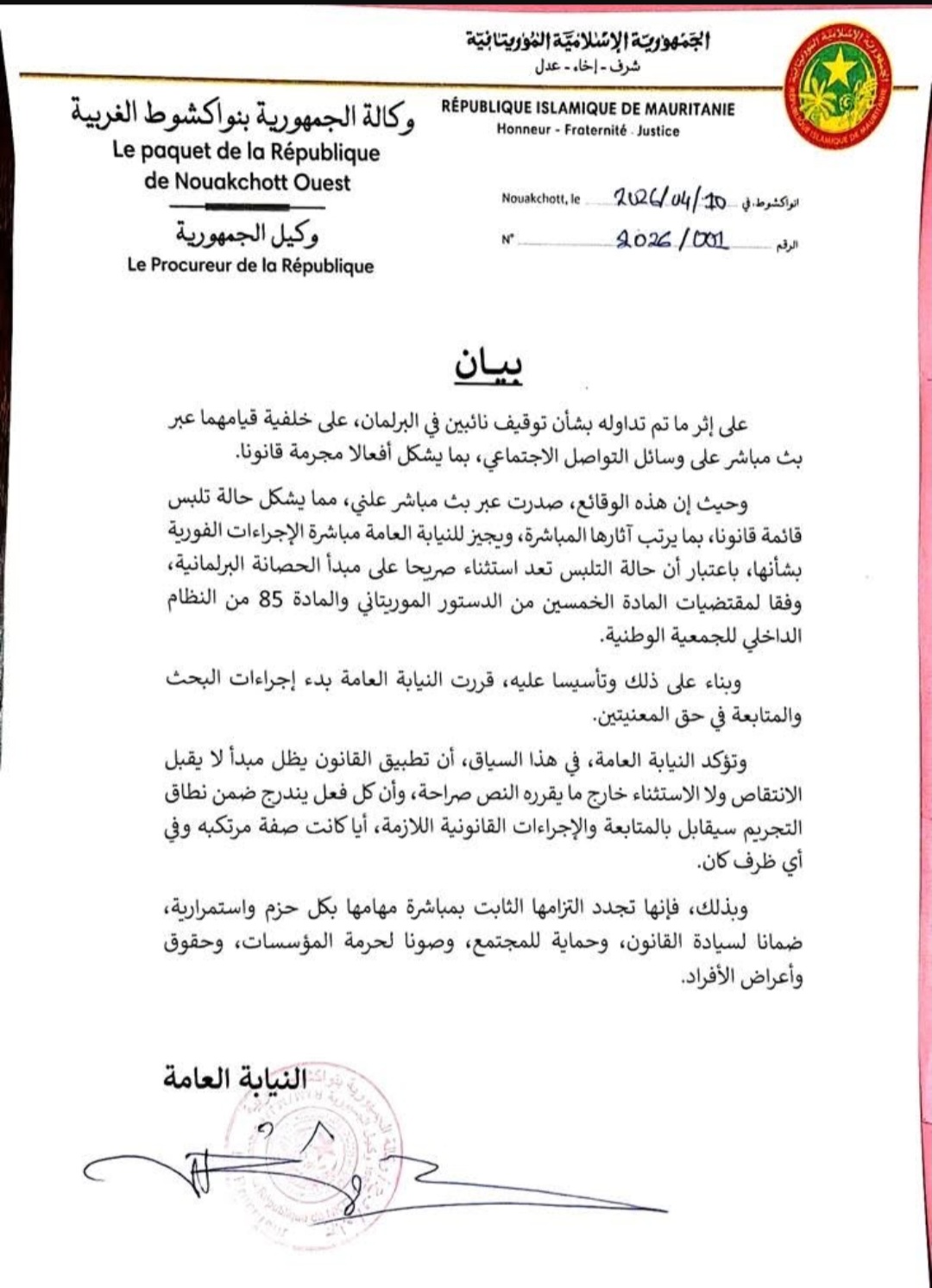 جاء ذلك عبر بيان أصدرته مساء أمس، بينت خلاله أن الوقائع جرت في بث مباشر علني، ما يشكل حالة تلبس وفق القانون، ويتيح لها مباشرة الإجراءات الفورية رغم الحصانة البرلمانية، استنادا إلى المادة 50 من الدستور الموريتاني والمادة 85 من النظام الداخلي للجمعية الوطنية.